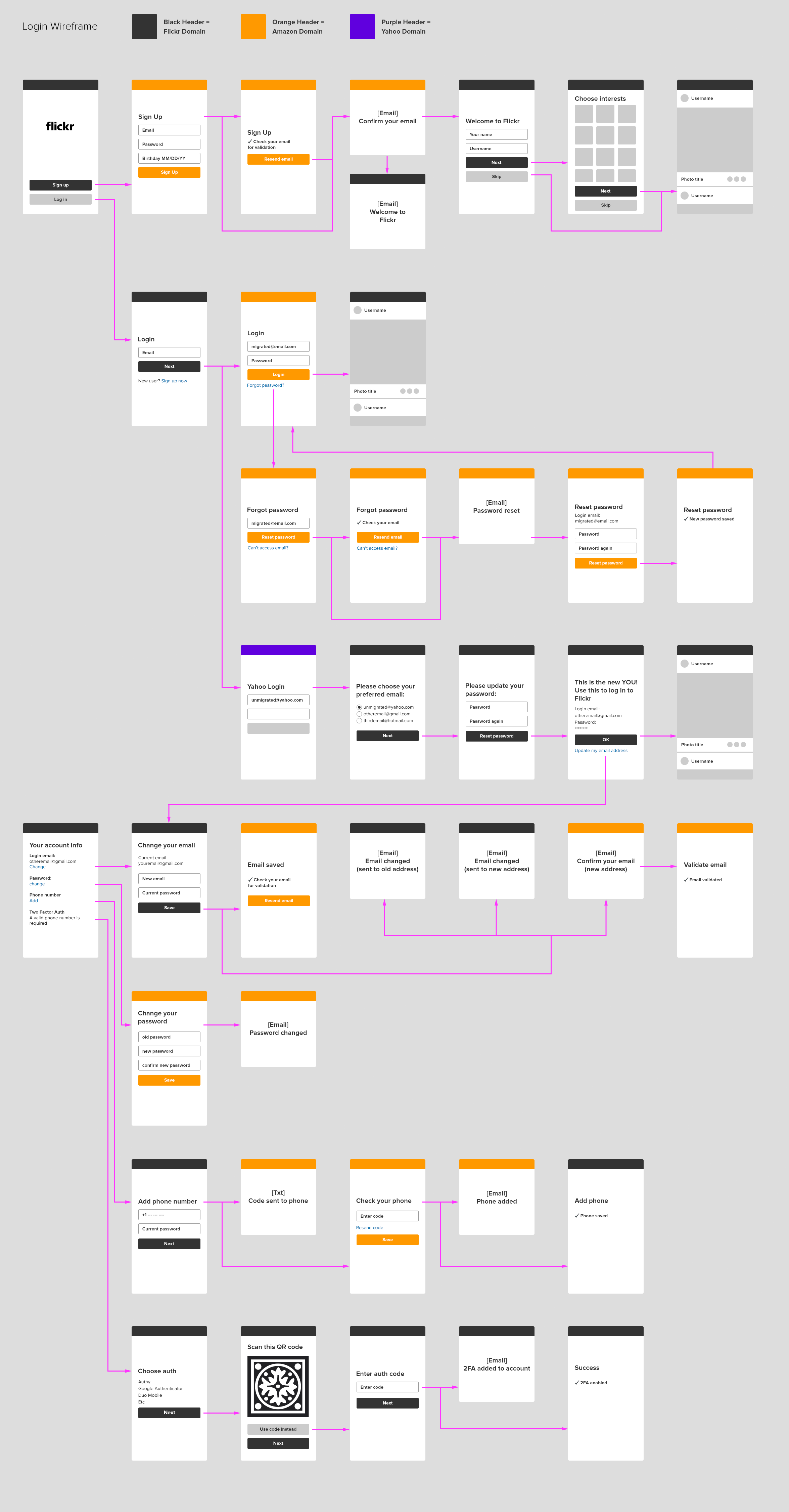 The new authentication system would span three domains: Flickr, Amazon Cognito, and Yahoo. The wireframe was a critical document to ensure teams and stakeholders were aligned on the project plan. We discussed what user flows were being built, what data were needed, and which domain was responsible for each step of the experience.